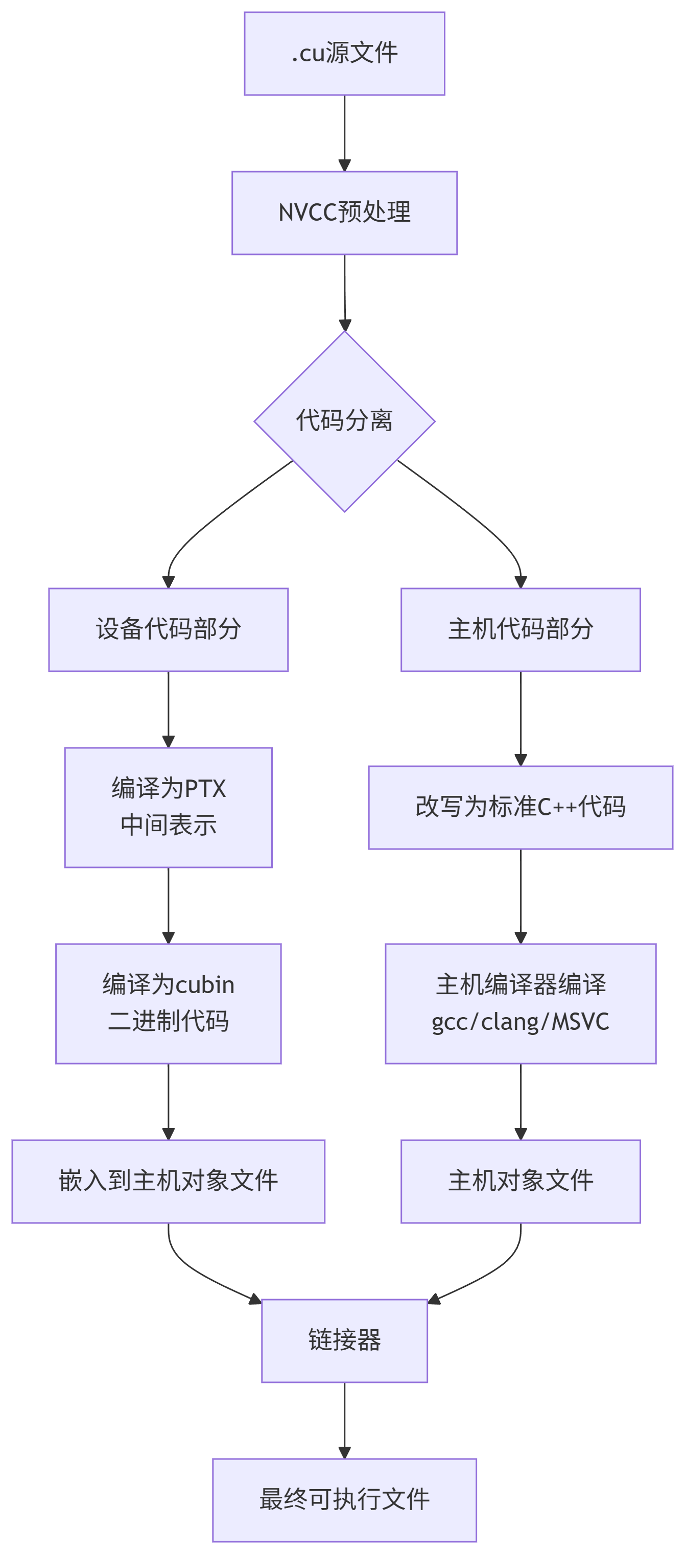 CUDA程序的编译是一个多阶段过程,涉及主机代码和设备代码的分离处理: