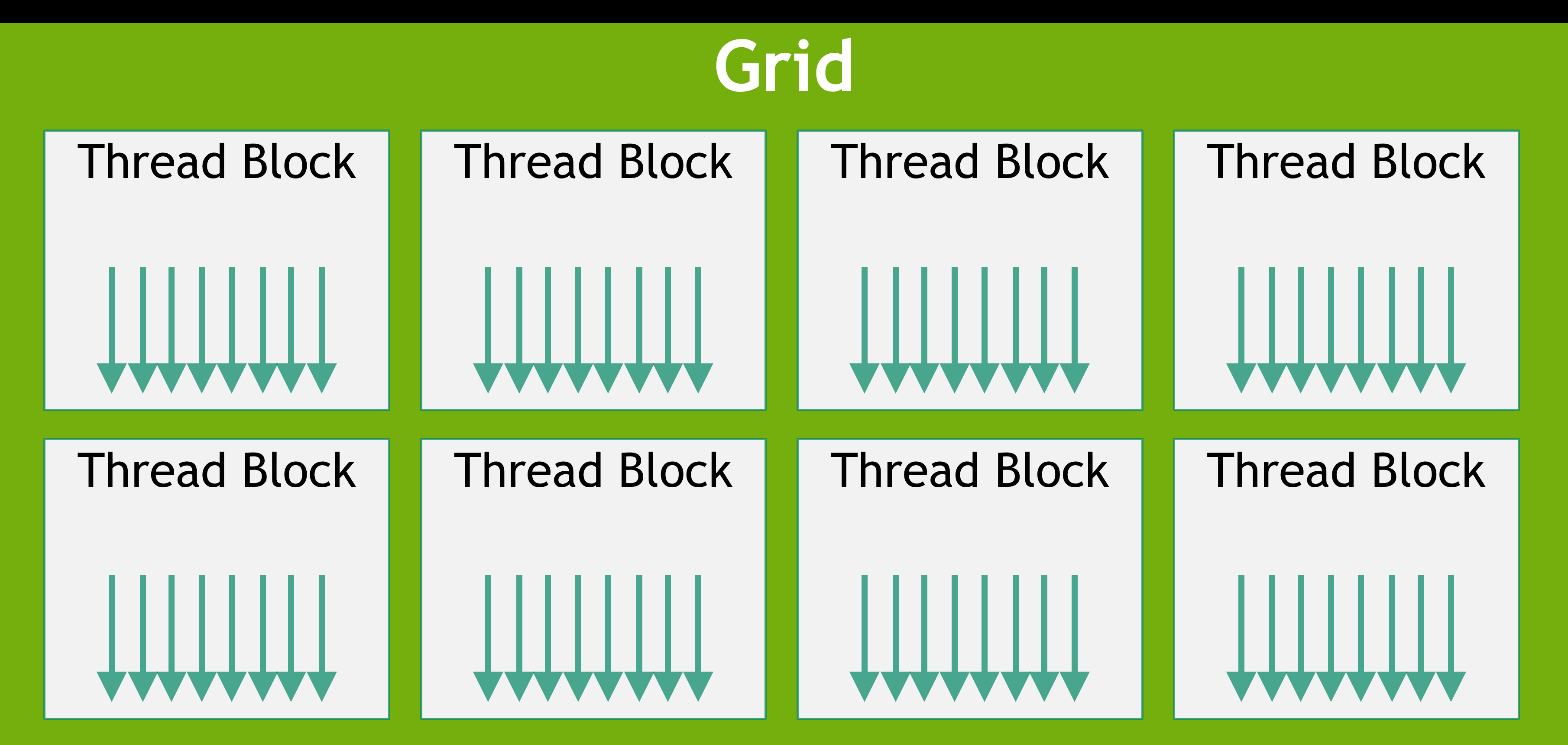 在核函数调用时,一个核函数可以由多个形状相同的线程块执行。因此,线程总数 = 每个线程块中的线程数 * 线程块的数量。