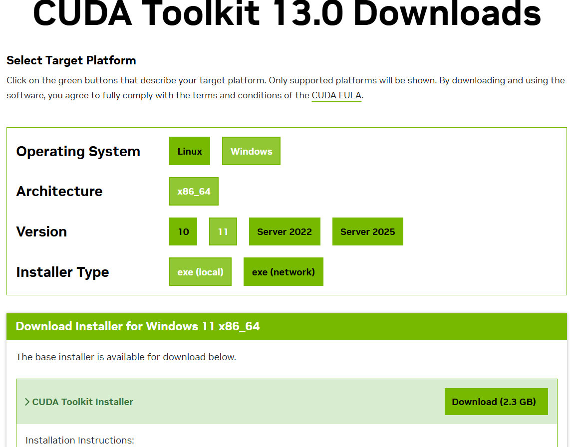 注意: Version这一栏指的是操作系统的版本,不是CUDA Toolkit的版本,如上图的10/11指的是Windows10/Windows11。 - 点击下载的安装程序(如