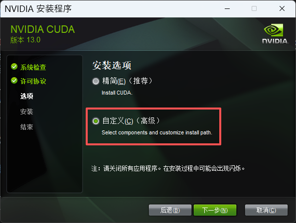 - 如果需要自定义安装路径,选择"自定义"安装,然后再选择安装路径。