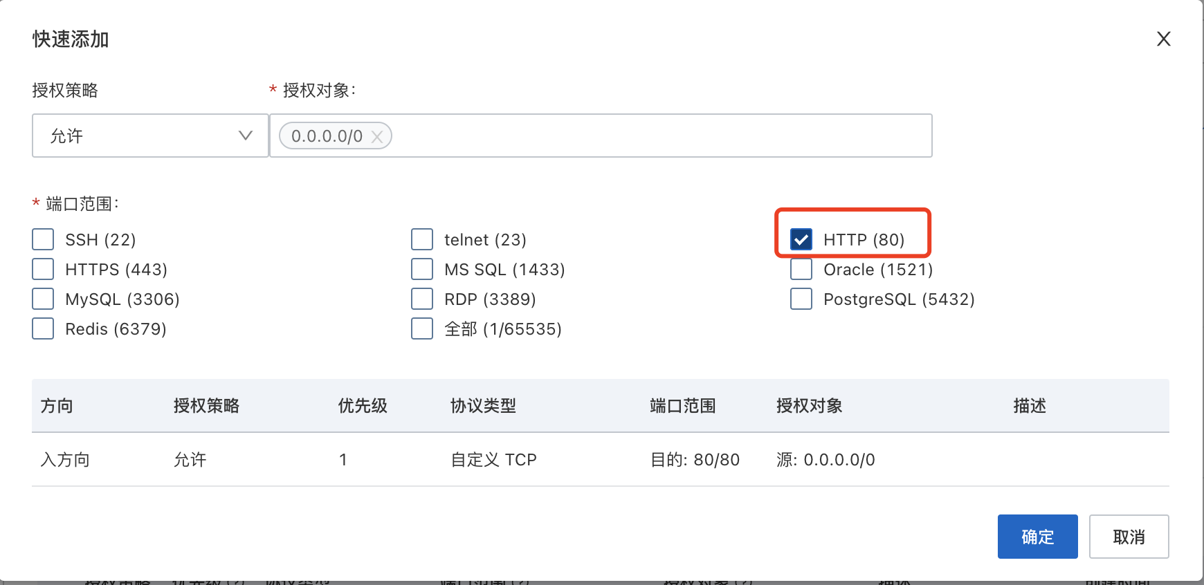 nginx服务的默认端口是80,而阿里云默认是禁止80端口访问权限的,所以我们要为实例手动添加安全组,让阿里云给相应的端口和IP放行。该步骤非常重要,若不手动配置,我们将无法通过“公网IP+端口”的方式访问我们的ECS服务器。